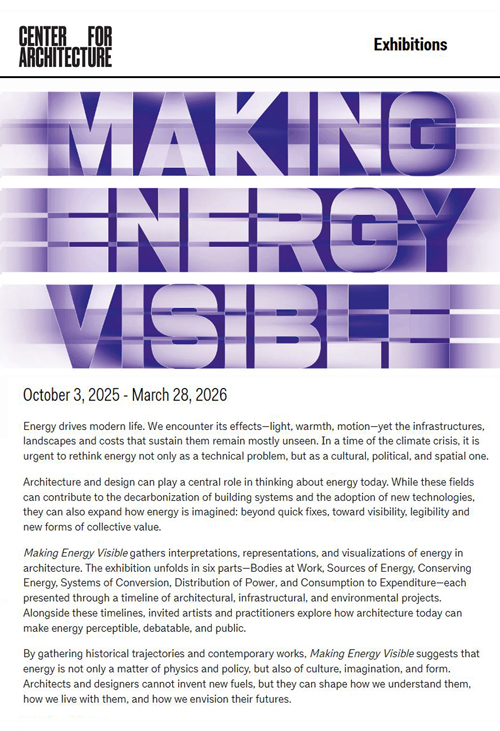 An invited exhibition exploring how architecture today can make energy perceptible, debatable, and public. Center for Architecture NYC